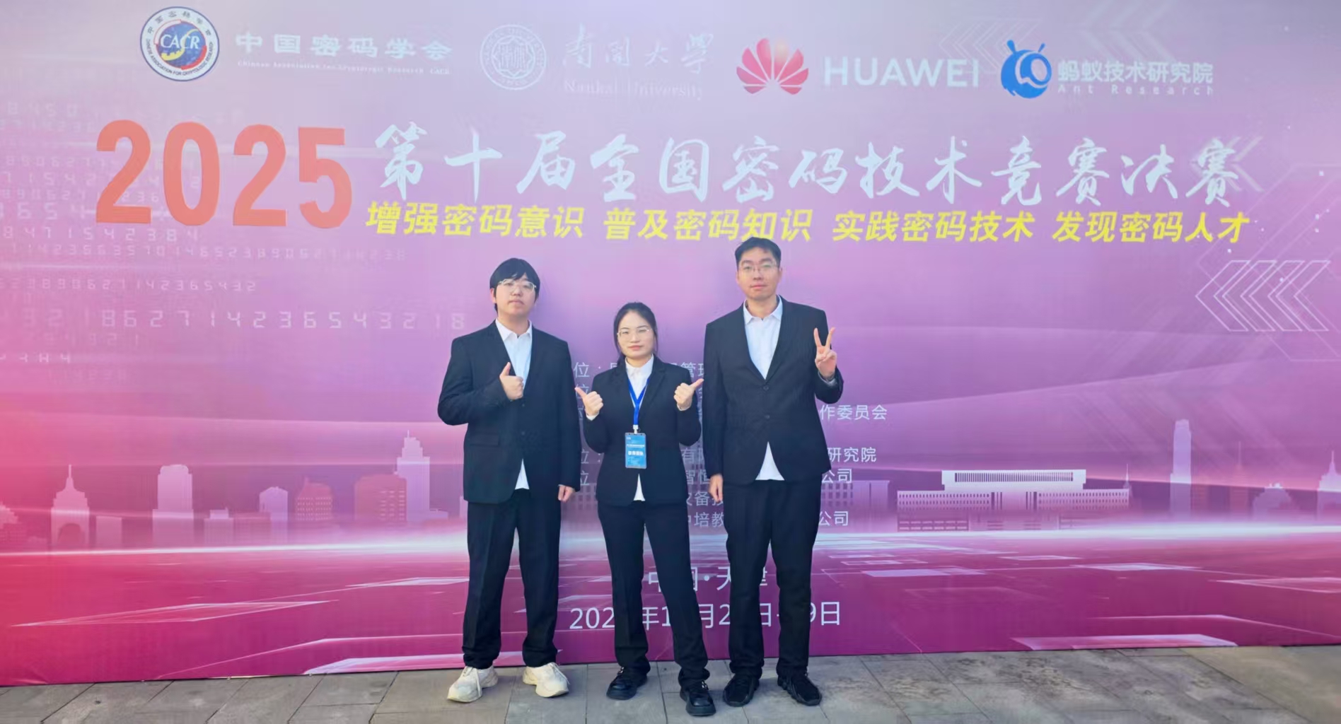 日前,由中国密码学会主办的2025第十届全国密码技术竞赛决赛在南开大学举办。经过激烈角逐,由张明武和王玉珠老师指导,我院网络空间安全研究所高晶、刘逸霖和赵延瑞共同完成的作品“基于鲲鹏的SM2算法优化”,从晋级决赛的186支队伍中脱颖而出,斩获全国二等奖。