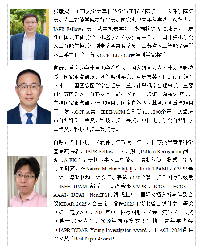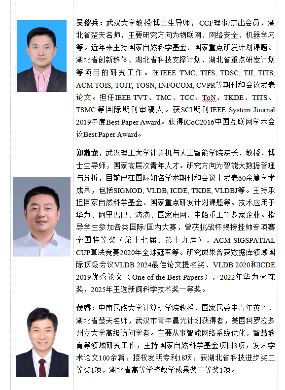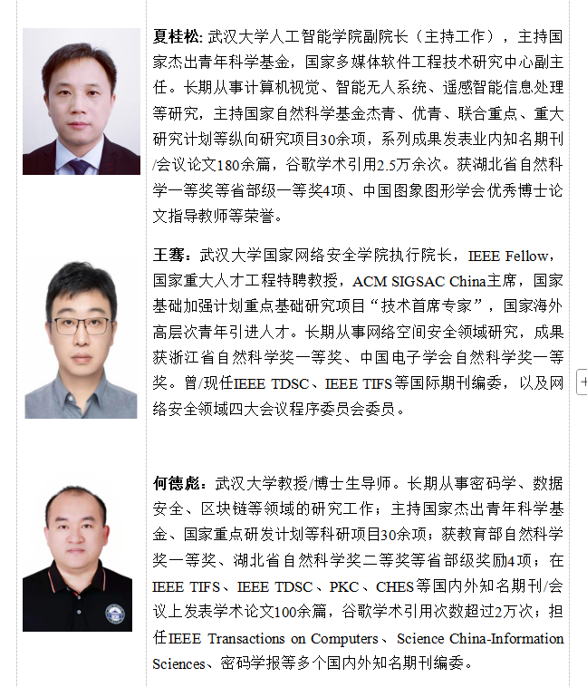 嘉宾简介 会议主席: 宋小春(湖北工业大学) 会议副主席: 贺行洋(湖北工业大学)、张晓星(湖北工业大学)、唐景峰(湖北工业大学) 会议执行主席: 叶志伟(湖北工业大学)、徐志刚(湖北工业大学) 程序委员会: 王骞(武汉大学)、吴黎兵(武汉大学)、何德彪(武汉大学)、侯睿(中南民族大学)、任东(三峡大学) 组织委员会主席: 张明武(湖北工业大学) 组织委员会副主席: 阮鸥(湖北工业大学)、严灵毓(湖北工业大学)、张吉昕(湖北工业大学) 何其祎(湖北工业大学)、王明威(湖北工业大学)、罗茂(湖北工业大学) 报告嘉宾: 张敏灵(东南大学)、向涛(重庆大学)、夏桂松(武汉大学)、白翔(华中科技大学) Panel嘉宾: 张敏灵(东南大学)、向涛(重庆大学)、夏桂松(武汉大学)、白翔(华中科技大学)、王骞(武汉大学)、吴黎兵(武汉大学)、侯睿(中南民族大学) |