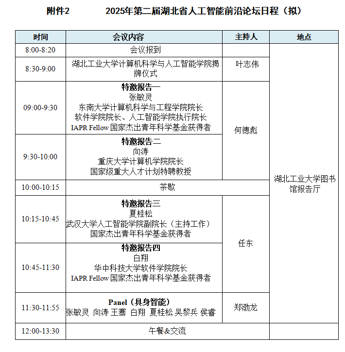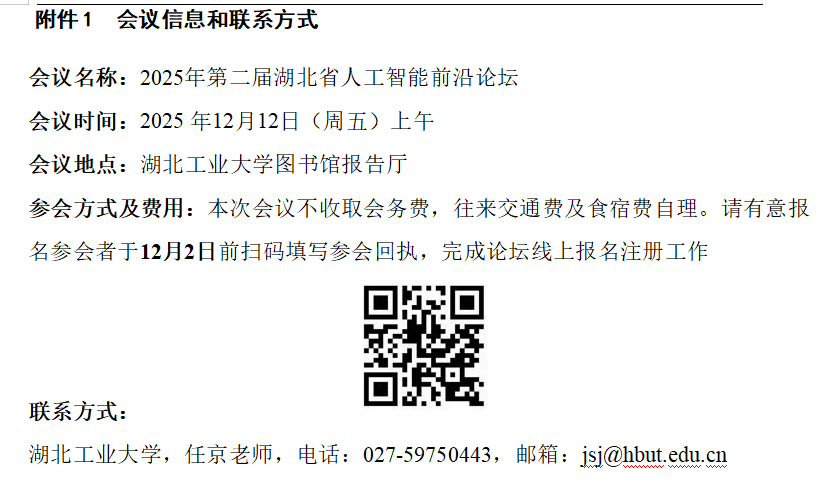 为落实国务院《关于深入实施“人工智能+”行动的意见》文件要求,进一步推动湖北省人工智能领域技术创新与应用发展,湖北工业大学、IEEE SPS Wuhan Chapter、绿色智能算力网络湖北省重点实验室、制造工业数智化技术与应用湖北省工程研究中心、CSIG武汉会员活动中心、ACM SIGSAC China将于2025年12月12日联合举办“2025年第二届湖北省人工智能前沿论坛”。本届论坛以习近平总书记围绕加快发展人工智能、推动高质量发展发表的系列重要论述为指引,深入探讨人工智能技术创新与应用、“人工智能+科学”、人工智能创新人才培养等问题,推动湖北省人工智能研究与产业高质量发展,提升人工智能背景下的人才培养质量。